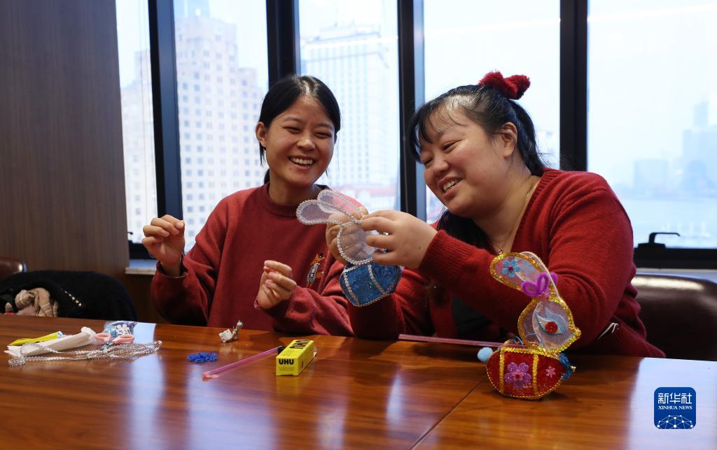 2月1日,龔智瑜(右)在上海外灘街道為社區企業職員講解兔子燈制作技法。