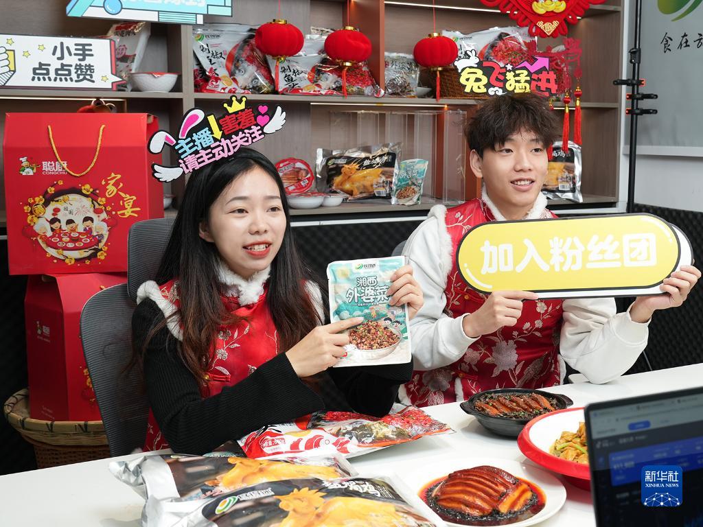 湖南網上年貨節期間,主播們在直播間向網友介紹特色菜品(1月12日攝)。新華社發