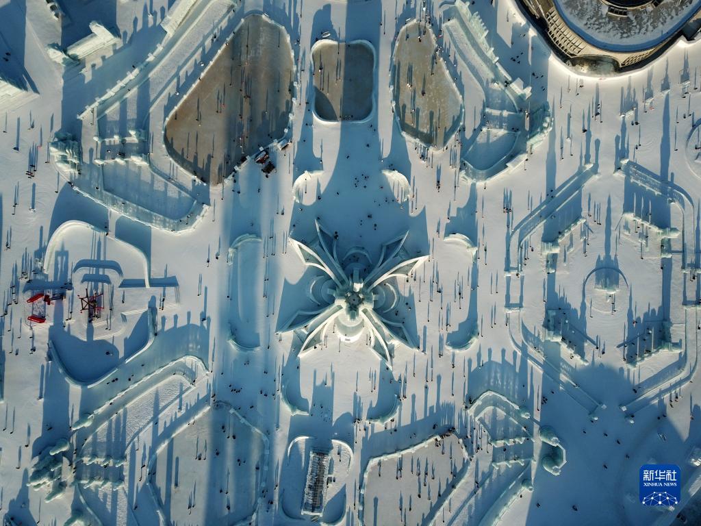 2月2日,游客在哈爾濱冰雪大世界園區(qū)內(nèi)游玩(無(wú)人機(jī)照片)。
