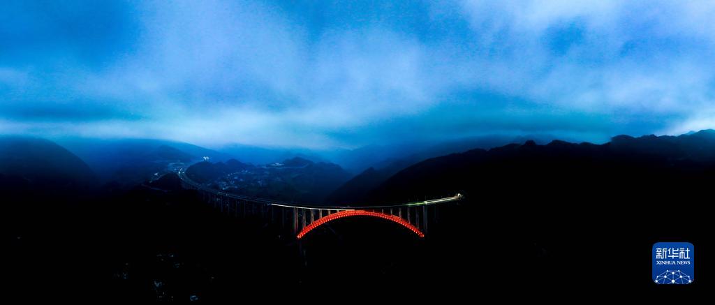 這是2月2日在貴州省遵義市拍攝的夜幕下的大發(fā)渠特大橋(無人機全景照片)。