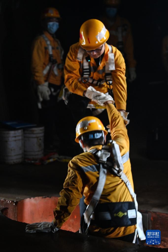 2月2日,橋梁工們在進入狹小的墩頂檢查口時互相攙扶。