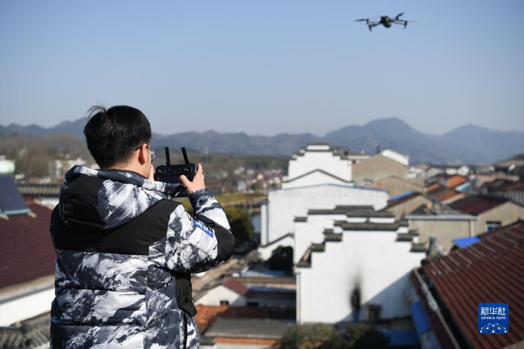 1月30日,郭昊在安徽省六安市舒城縣湯池鎮利用無人機航拍器拍攝小鎮風景。