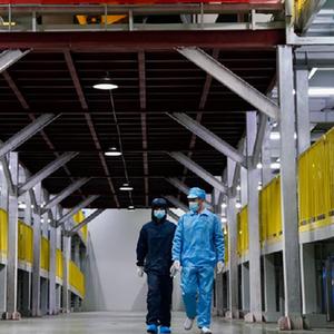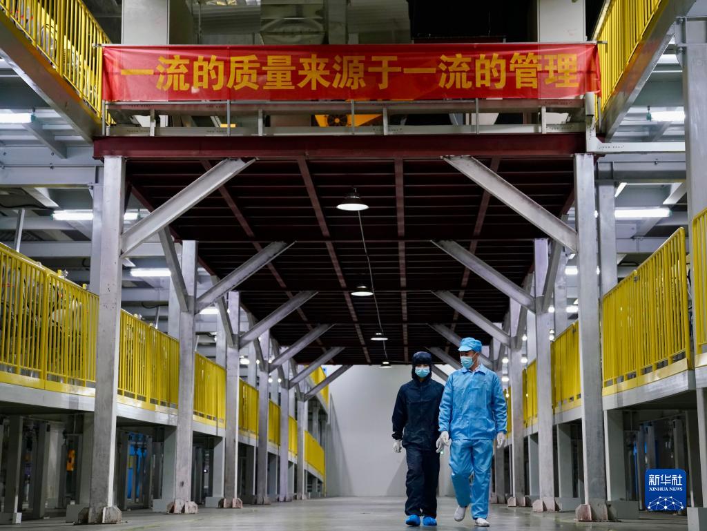 江西國軒新能源科技有限公司實習員工周詩航(左)和同事走在公司的廠房內(2月2日攝)。