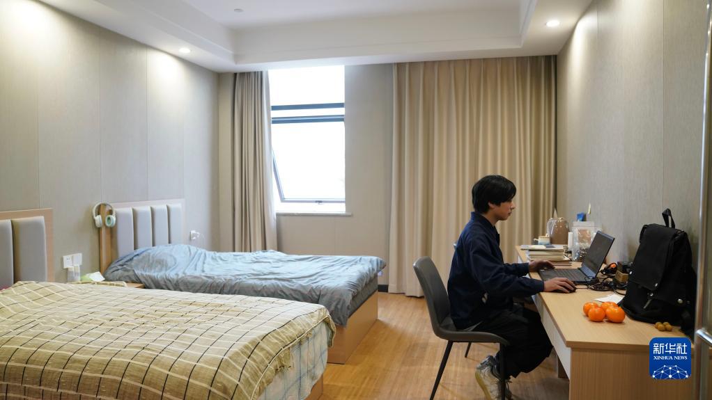 江西國(guó)軒新能源科技有限公司實(shí)習(xí)員工周詩(shī)航在公司的宿舍內(nèi)上網(wǎng)(2月2日攝)。