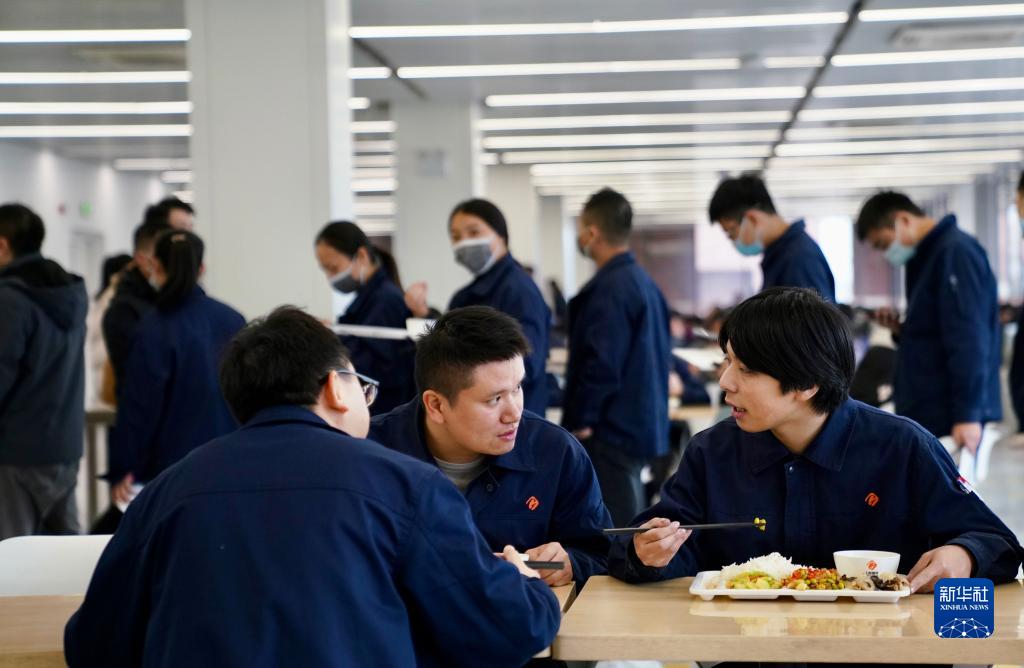 江西國軒新能源科技有限公司實習員工周詩航(右)和同事在公司的食堂吃飯(2月2日攝)。