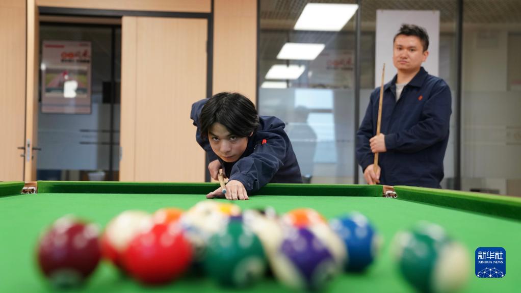 江西國軒新能源科技有限公司實習員工周詩航在公司的休息室內和同事一起打桌球(2月2日攝)。