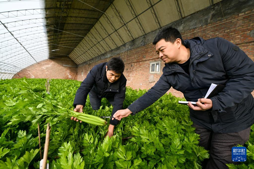 2月2日,研究員高國(guó)訓(xùn)(左)與副研究員吳鋒在天津市農(nóng)業(yè)科學(xué)院創(chuàng)新基地查看記錄芹菜雜交試驗(yàn)種生長(zhǎng)情況。