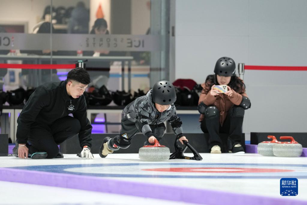 游客在“冰立方”冰上運(yùn)動(dòng)中心體驗(yàn)冰壺(2月1日攝)。