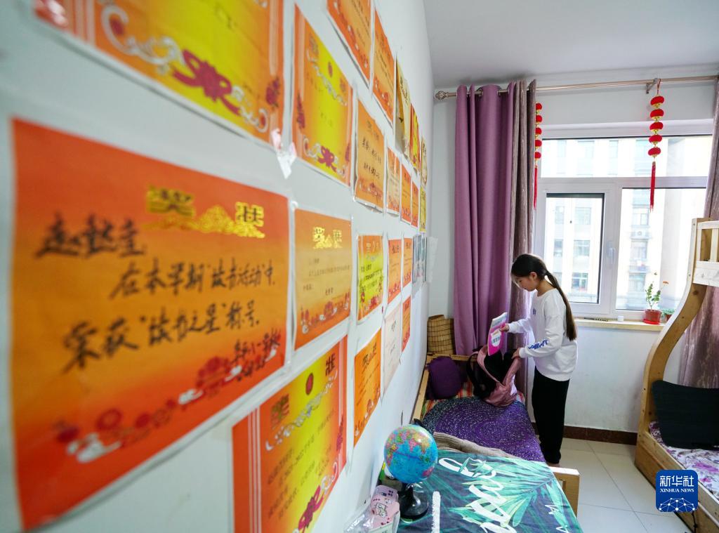 在河北省保定市阜平縣,馬蘭花兒童聲合唱團團員趙懿萱在房間內整理書包(1月29日攝)。