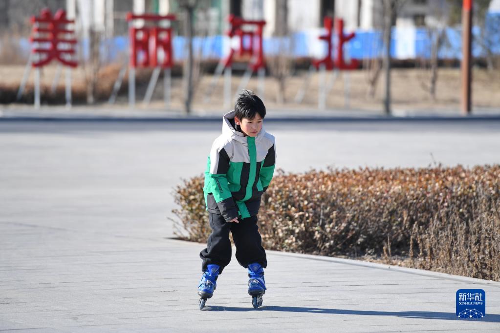 馬蘭花兒童聲合唱團(tuán)團(tuán)員顧站豪在河北省保定市阜平縣的一個(gè)廣場(chǎng)上滑輪滑(1月30日攝)。