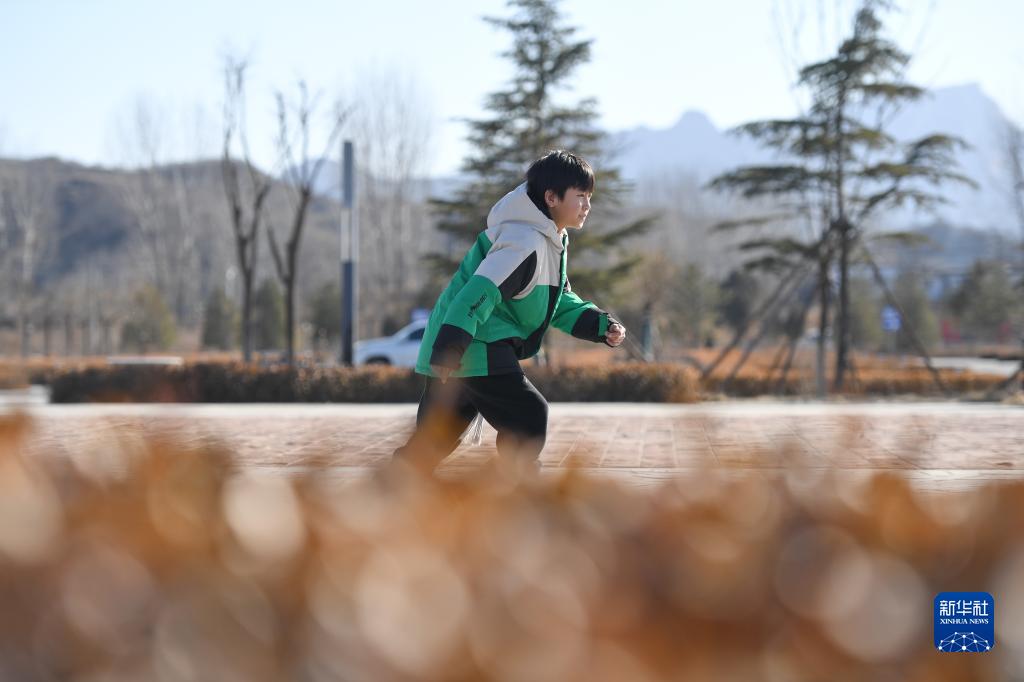 馬蘭花兒童聲合唱團團員顧站豪在河北省保定市阜平縣的一個廣場上滑輪滑(1月30日攝)。