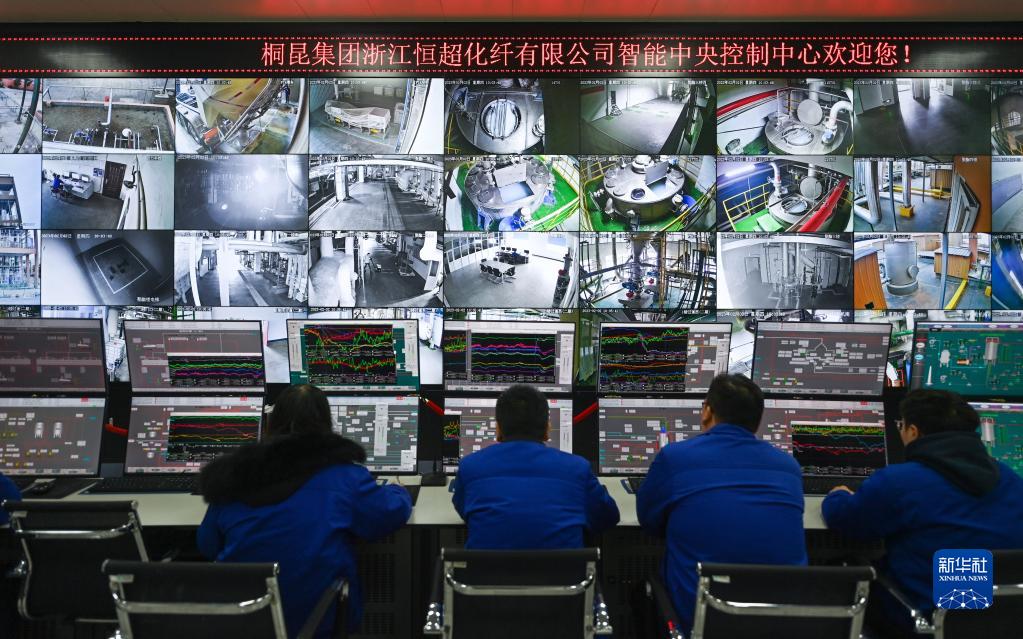 位于桐鄉(xiāng)市洲泉鎮(zhèn)工業(yè)園區(qū)的桐昆集團浙江恒超化纖有限公司的智控中心內(nèi),工作人員在查看各條生產(chǎn)線的運行情況(2月2日攝)。春節(jié)期間,該公司的生產(chǎn)設(shè)備全負荷運轉(zhuǎn),1000多名職工堅守在生產(chǎn)一線,全力沖刺一季度“開門紅”。