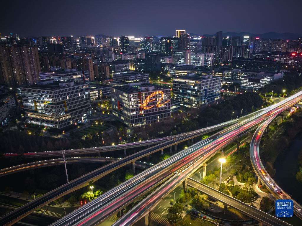 杭州市濱江區(qū)互聯(lián)網(wǎng)小鎮(zhèn)夜景(1月29日攝,無(wú)人機(jī)照片)。