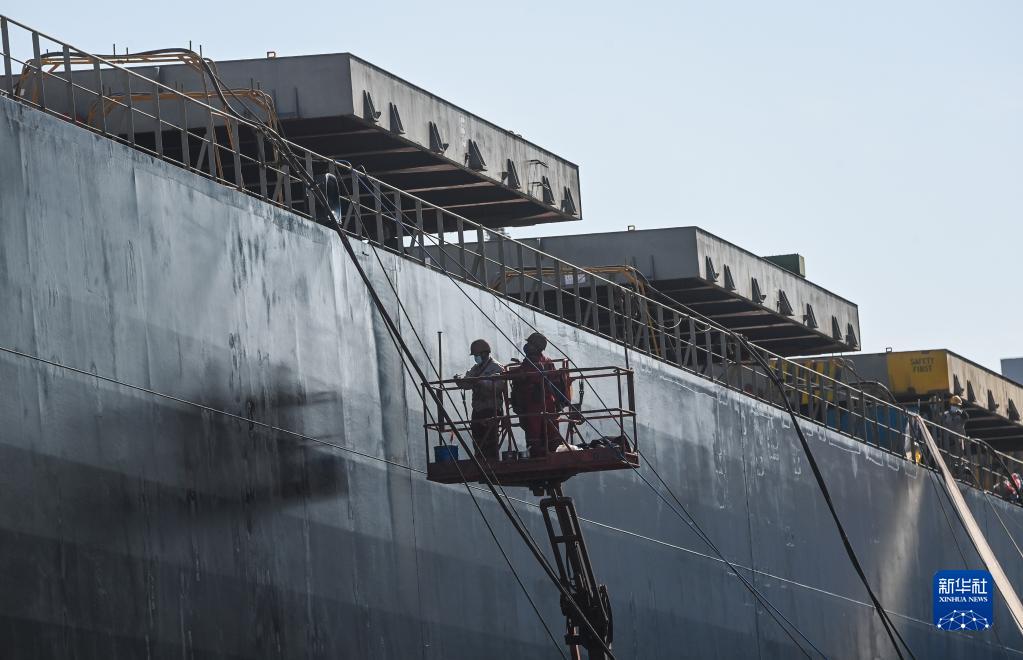 萬邦船舶重工(舟山)有限公司的船塢內,工作人員在對一艘外籍貨輪進行修理作業(1月31日攝)。春節期間,位于舟山市普陀區小干島的萬邦船舶重工(舟山)有限公司的沿海岸線碼頭上排滿等待修理的船舶,一臺臺高空作業平臺車環繞著萬噸巨輪加緊運轉作業,一季度訂單已經全部排滿。