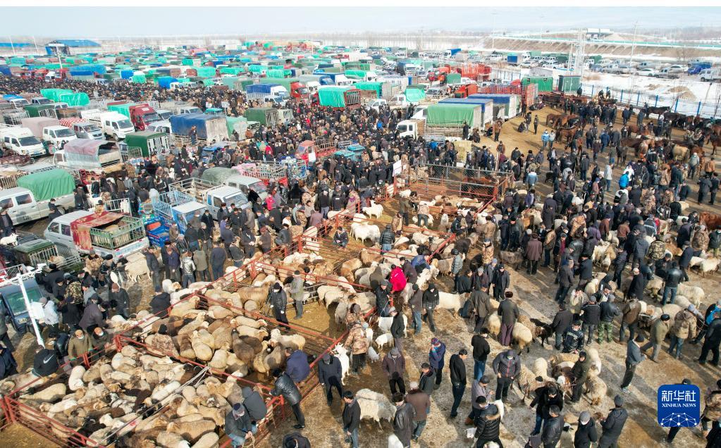 2月1日,位于新疆伊寧縣愉群翁回族鄉(xiāng)阿勒推村的新疆創(chuàng)錦黃公農(nóng)產(chǎn)品交易市場開市,市場商品琳瑯滿目,牛羊馬交易火爆。