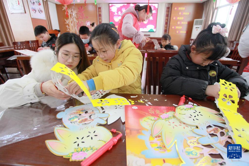 2月3日,江蘇省揚州市杉灣花園社區志愿者在指導小朋友做花燈。