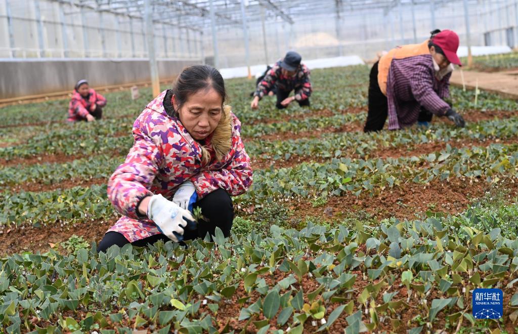 2月3日,工人在貴州玉屏侗族自治縣油茶基地的育苗中心育苗。