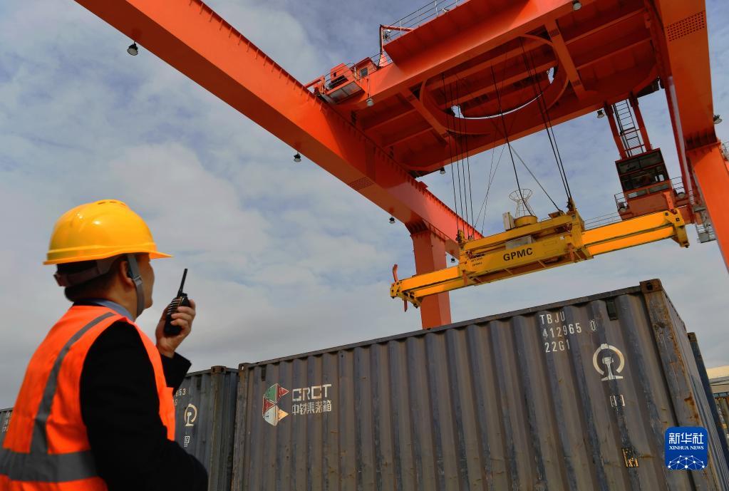 2月3日,在興泉鐵路黃塘站,貨運員指揮吊運中歐班列貨箱。