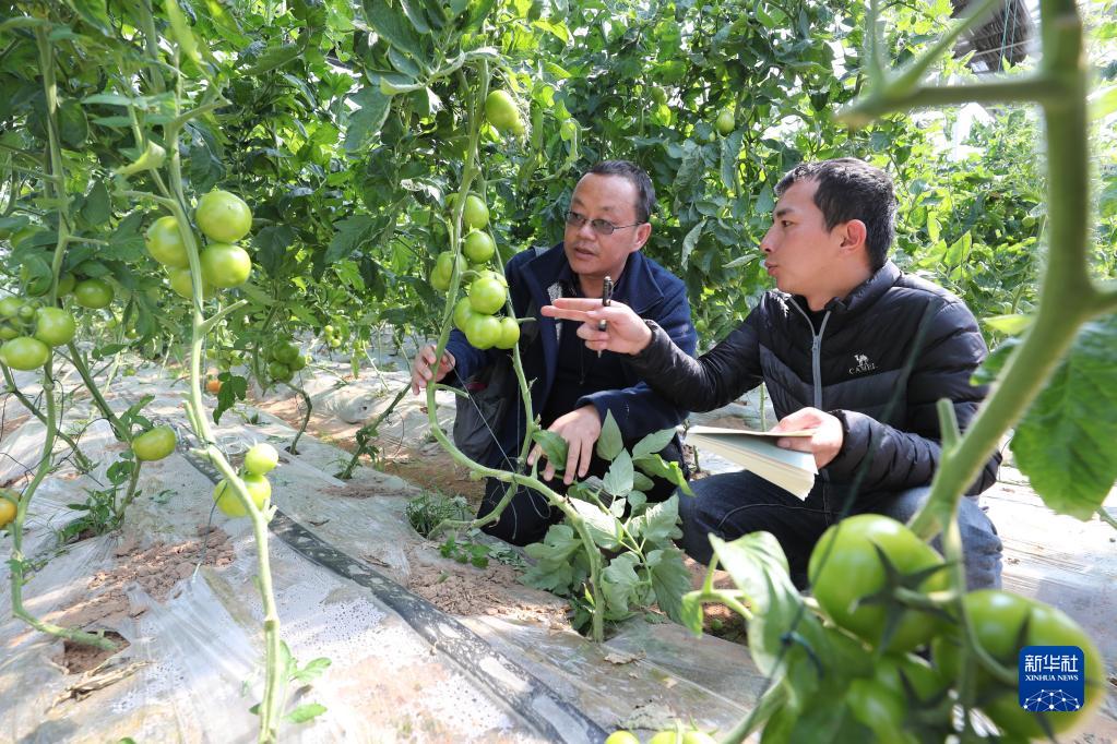 2月2日,在福州市瑯岐“菜籃子”基地,種植企業(yè)技術(shù)人員(右)向福州市蔬菜科學(xué)研究所科技特派員高山請教番茄栽培技術(shù)。