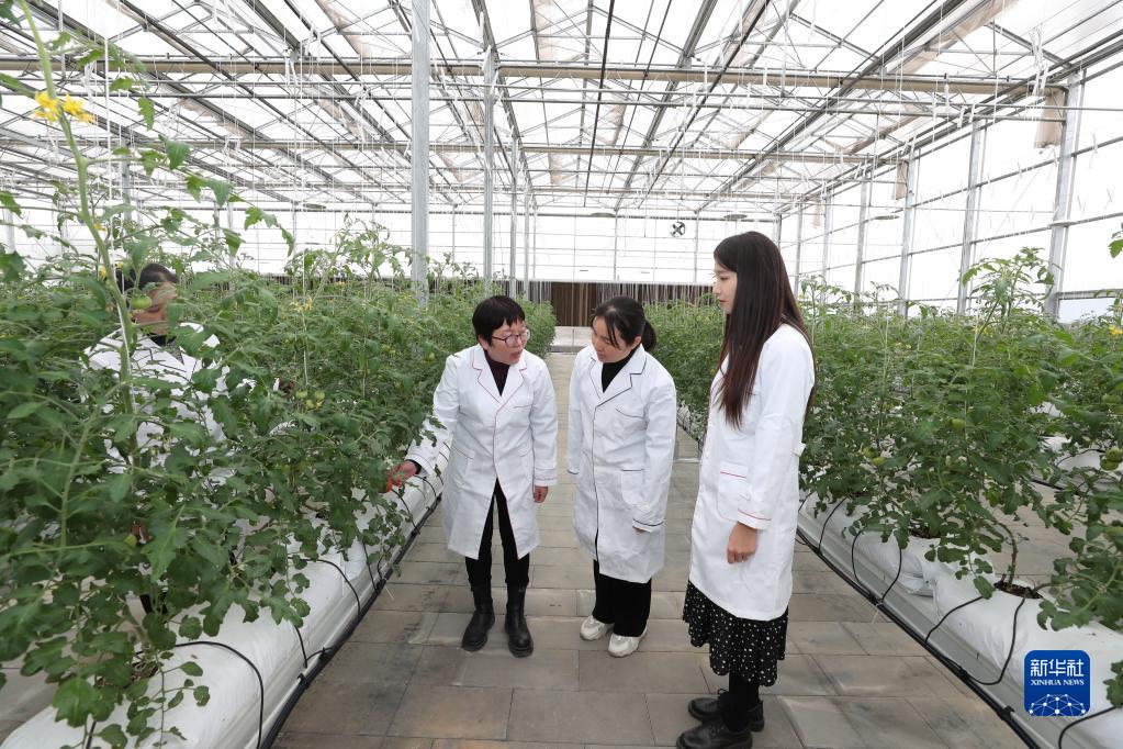 2月3日,在福州市蔬菜科學(xué)研究所種植大棚,所長陳秀娟(右三)與團(tuán)隊科研人員討論廢菌包在蔬菜無土栽培中的應(yīng)用技術(shù)。