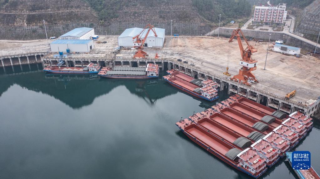 2月3日,貨船在余慶縣沙灣碼頭裝載貨物(無人機照片)。