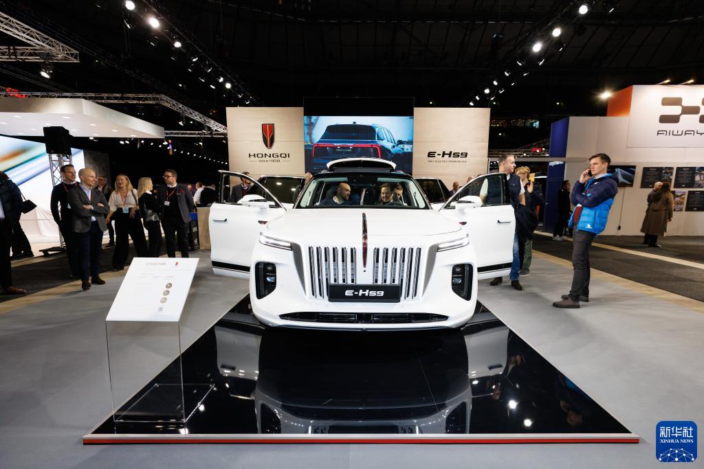 2月3日,人們在瑞典斯德哥爾摩舉辦的電動車展上參觀紅旗電動車。