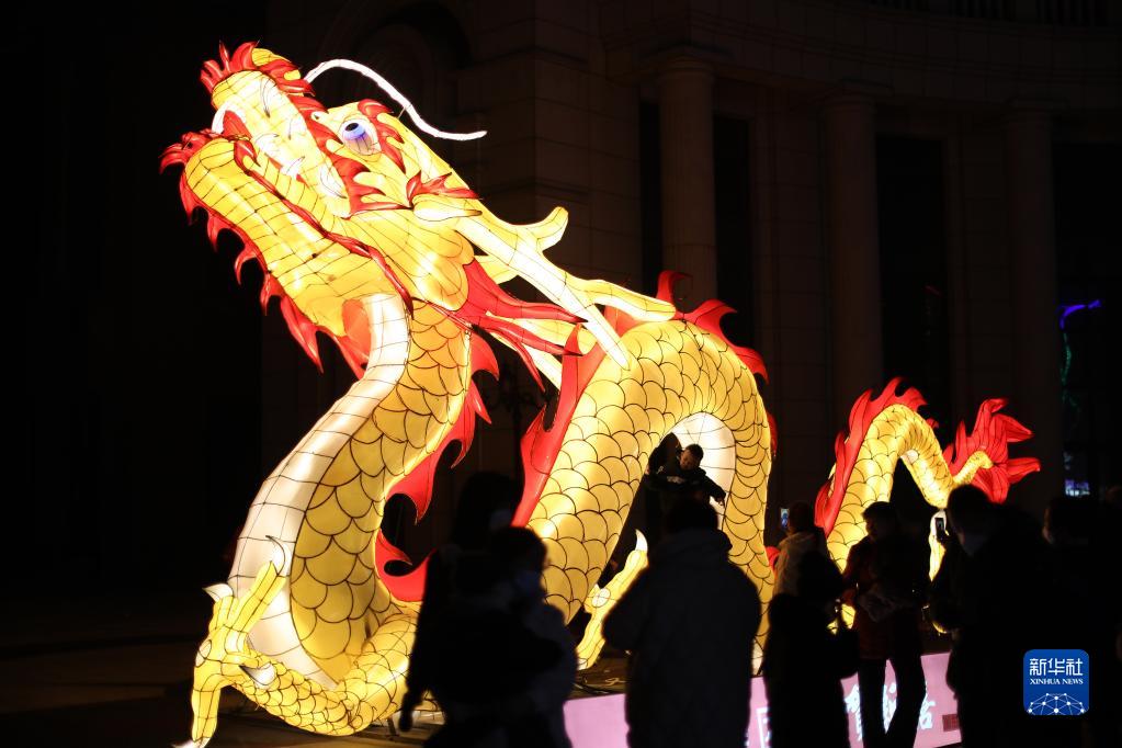 2月3日,游客在營口遼河老街觀賞龍形花燈。