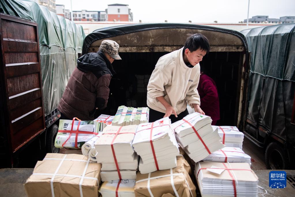 2月4日,工作人員在祁陽市新華書店教材中轉庫搬運教材。