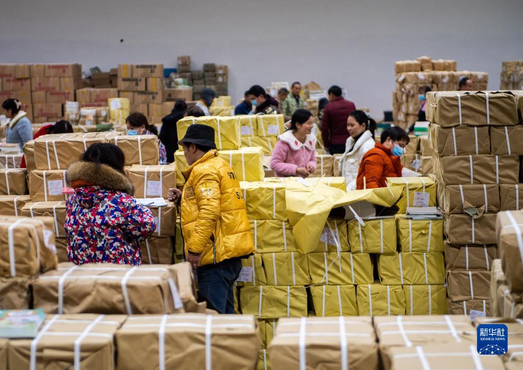 2月4日,在祁陽市新華書店教材中轉(zhuǎn)庫,工作人員在分發(fā)教材。
