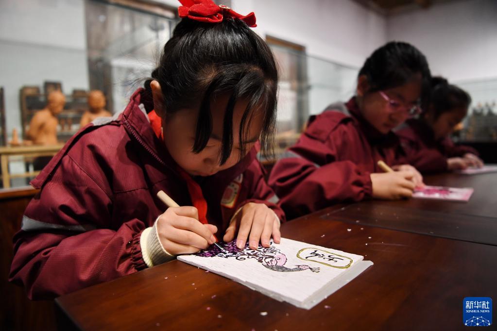 2月3日,小朋友們?cè)谖鋸?qiáng)年畫博物館練習(xí)制作木版年畫。