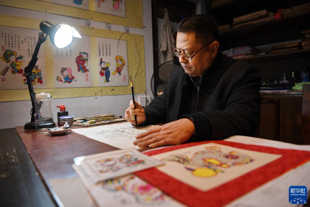 2月3日,武強木版年畫藝人在武強年畫博物館技藝展示區創作生肖兔主題年畫。