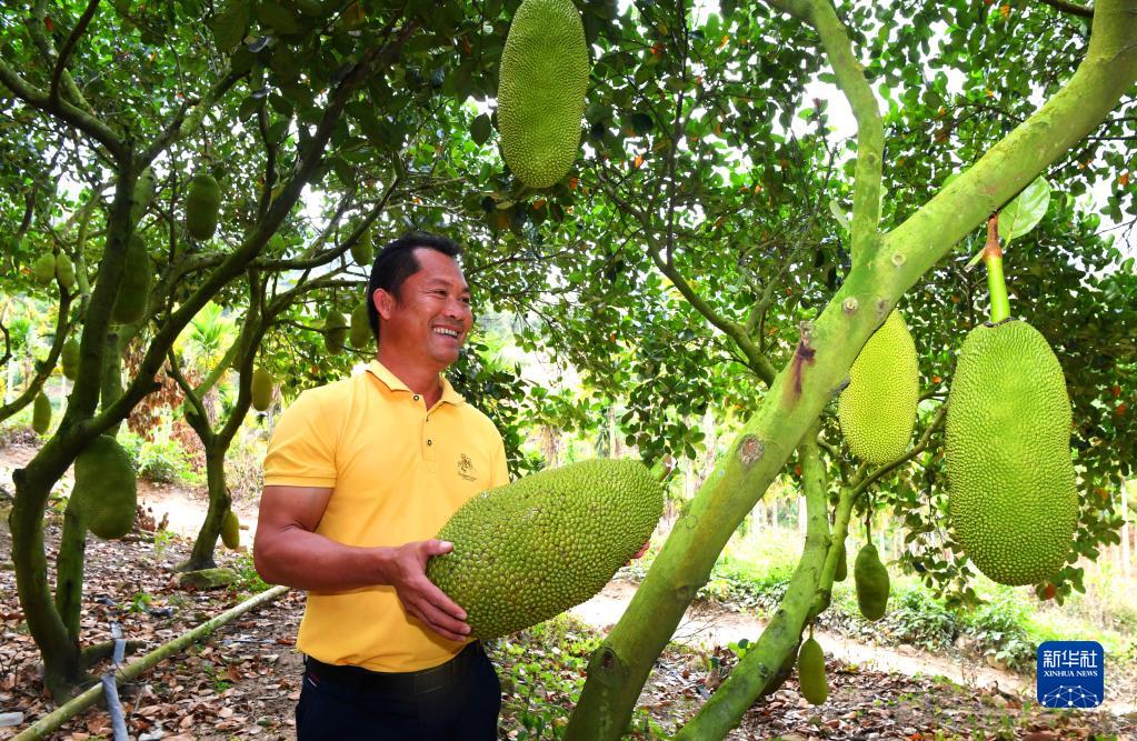海南省三亞市育才生態區那受村農戶蘇正榮展示采摘的菠蘿蜜(2月2日攝)。