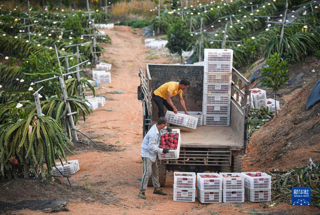 在海南省三亞市育才生態(tài)區(qū)“水果島”火龍果基地,人們將采收的火龍果裝車(2月1日攝)。
