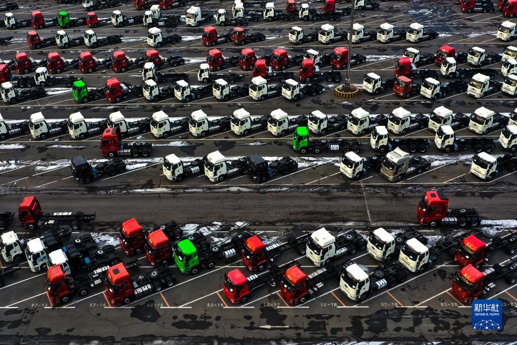 這是1月31日在吉林長(zhǎng)春拍攝的一汽解放智慧物流公司整車(chē)物流部停車(chē)場(chǎng)內(nèi)即將轉(zhuǎn)運(yùn)交付的車(chē)輛(無(wú)人機(jī)照片)。