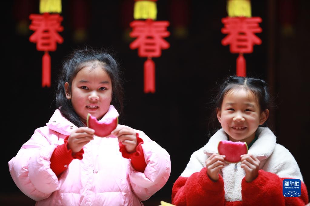 2月4日,在浙江省杭州市臨安區天目山鎮交口村文化禮堂,小朋友吃蘿卜“咬春”。