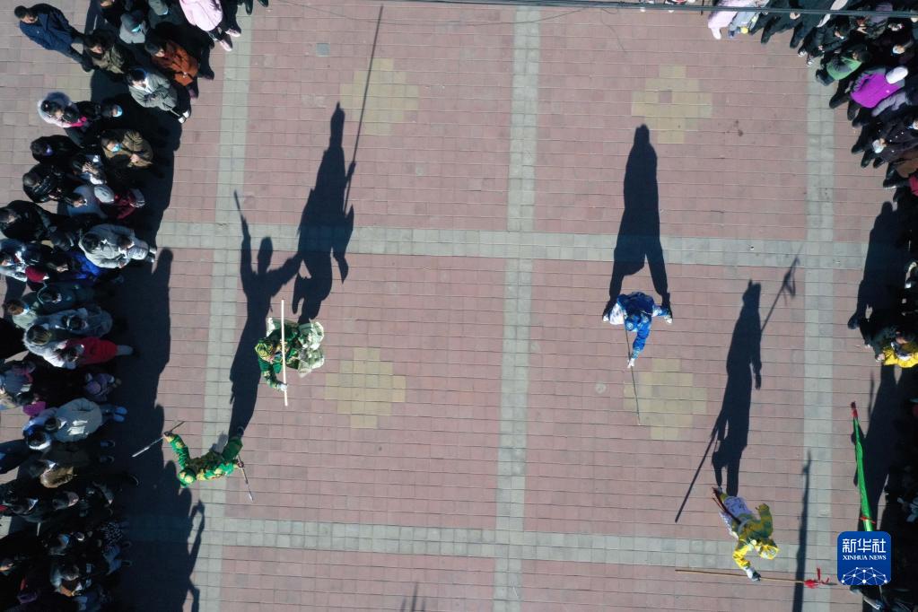 2月4日,在豐寧縣黃旗鎮(zhèn)黃旗東村文化廣場,民間藝人表演“黃旗武會”(無人機照片)。
