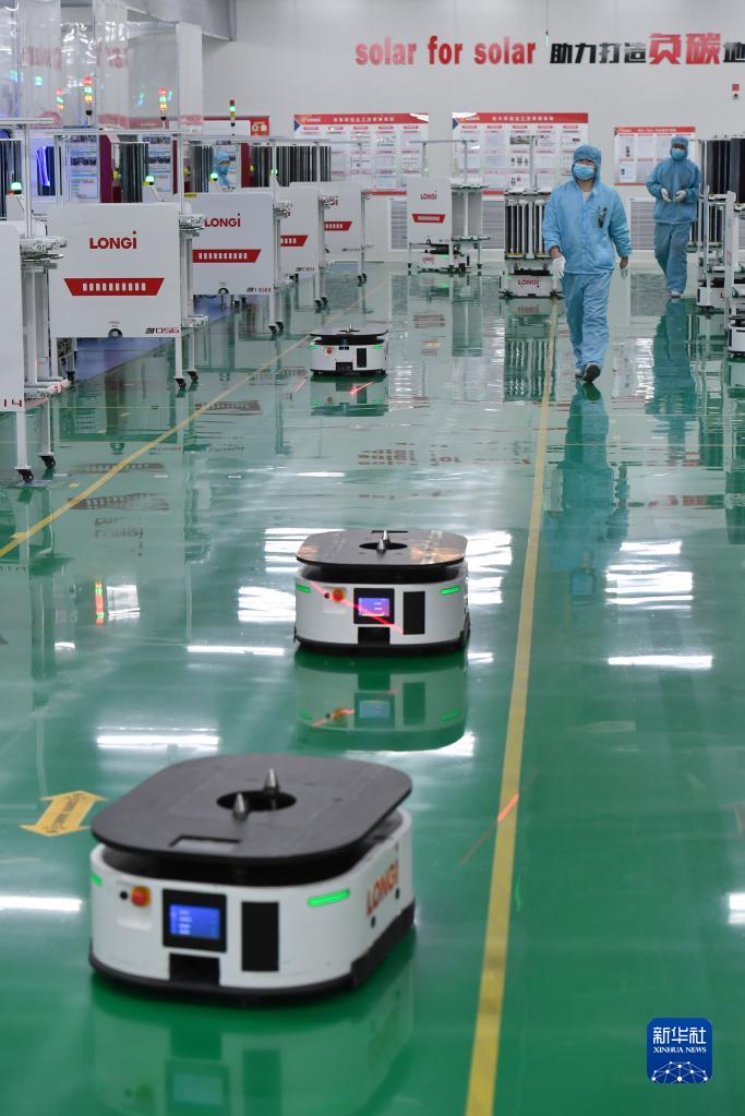 2月2日在隆基綠能高陵電池工廠內(nèi)拍攝的智能搬運(yùn)機(jī)器人。