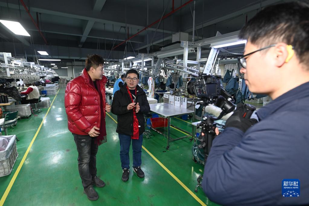 2月4日,在義烏市蘇溪鎮(zhèn)棒杰數(shù)碼針織品有限公司車間,企業(yè)負(fù)責(zé)人(左二)通過線上直播介紹企業(yè)情況及用工需求。