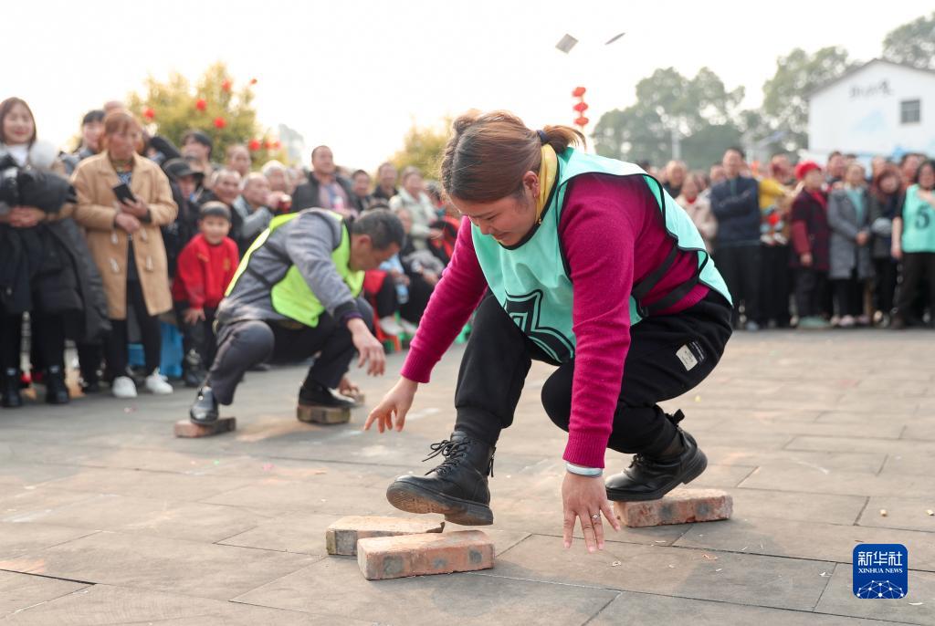 2月3日,四川省華鎣市華龍街道辦事處的居民在東方村參加趣味活動“摸石頭過河”。