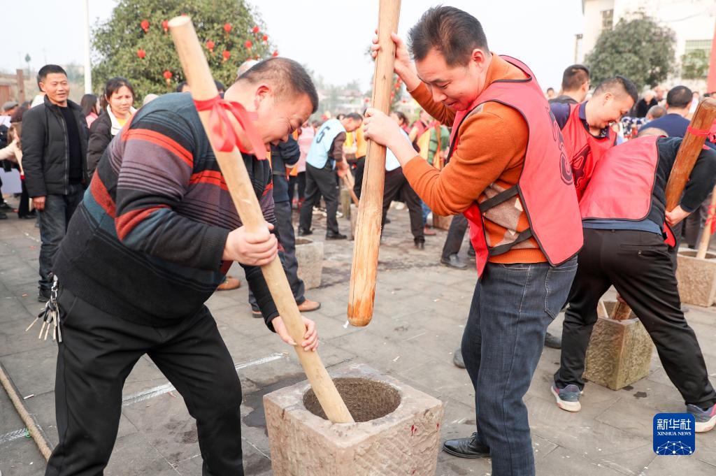 2月3日,四川省華鎣市華龍街道辦事處的居民在東方村參加趣味活動“打糍粑”。