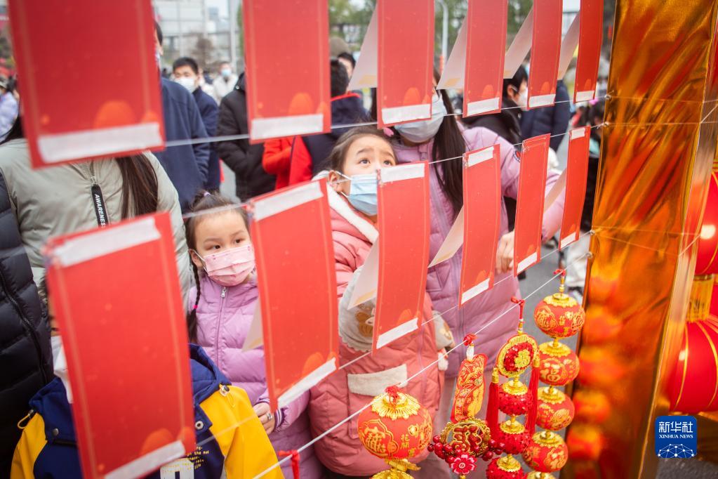 2月4日,小朋友在湖北省武漢市武漢體育中心舉行的中國車谷新春游園燈會上猜燈謎。