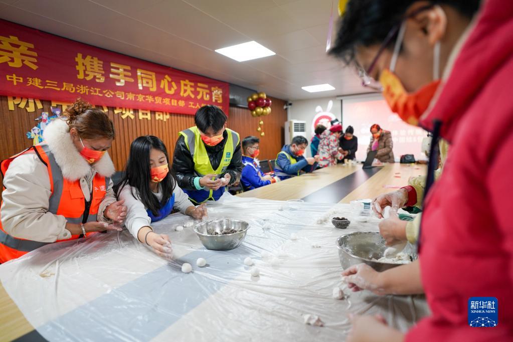 2月4日,在中建三局浙江公司南京華貿中心項目部,工人和南京市鼓樓區工人新村社區居民一起做湯圓。