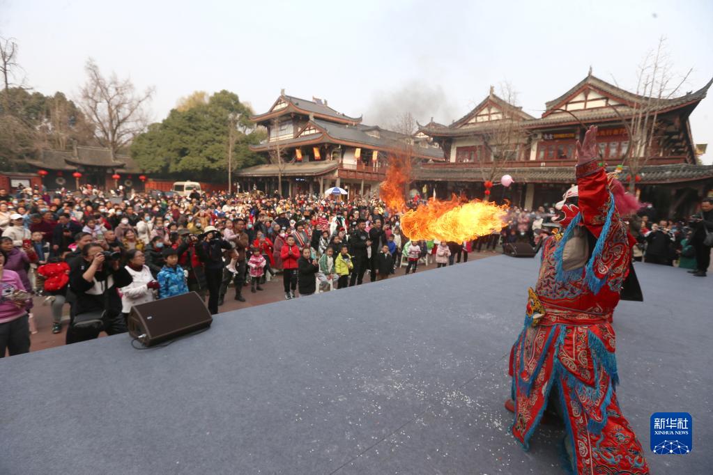 2月3日,在四川省眉山市東坡區三蘇祠前的啟賢廣場,演員在表演川劇。