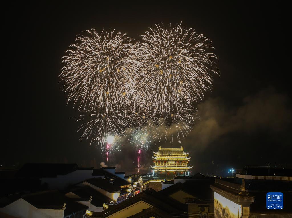 2月4日,浙江省建德市梅城鎮(zhèn)嚴(yán)州古城的澄清門上空焰火綻放(無人機(jī)照片)。