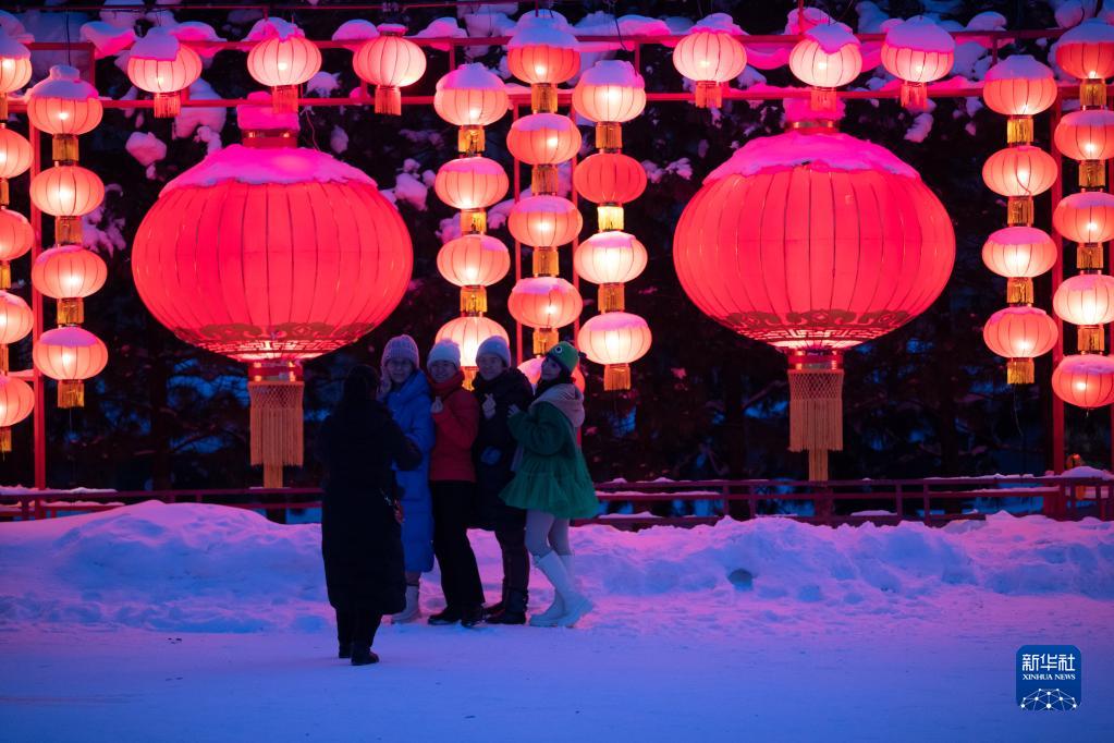 2月4日,游客在位于黑龍江省牡丹江市的大海林林業(yè)局有限公司雙峰林場雪鄉(xiāng)景區(qū)內(nèi)拍照留念。