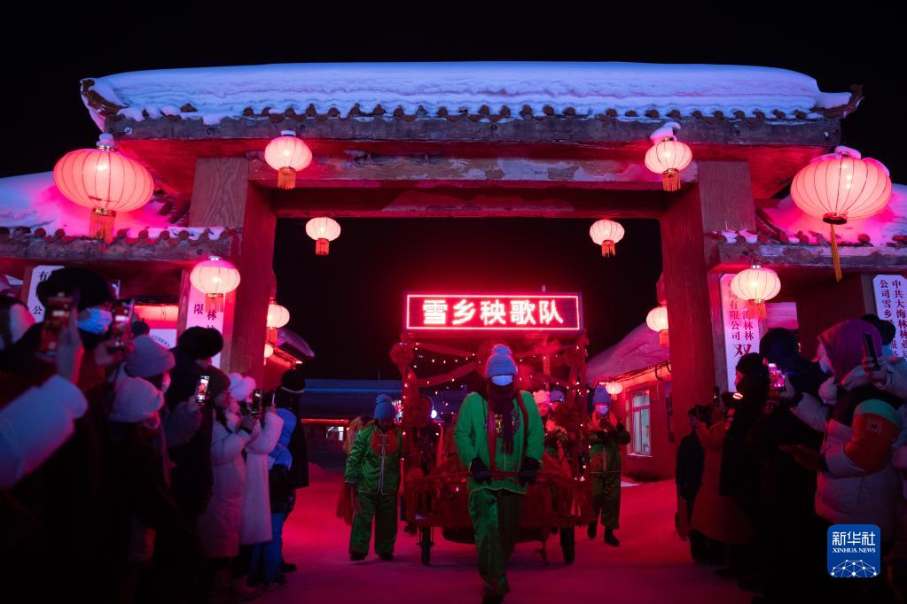 2月4日,秧歌隊在位于黑龍江省牡丹江市的大海林林業局有限公司雙峰林場雪鄉景區內表演。
