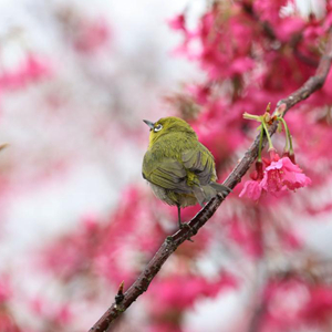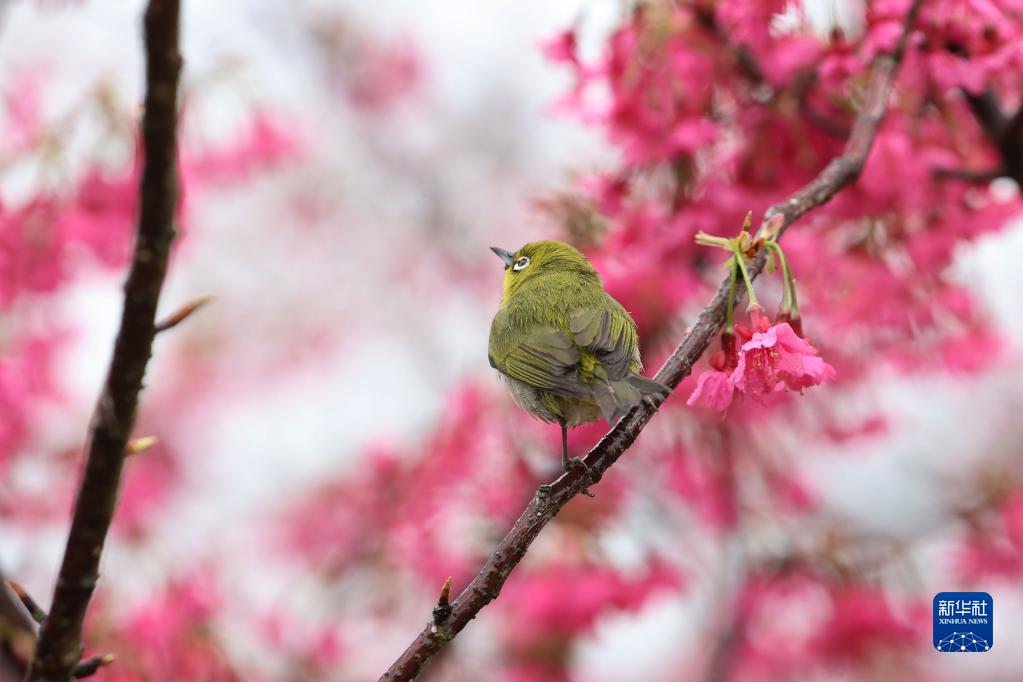 2月4日,在廈門市翔安區妙高山一處生態茶園,一只繡眼鳥在櫻花枝頭上小憩。
