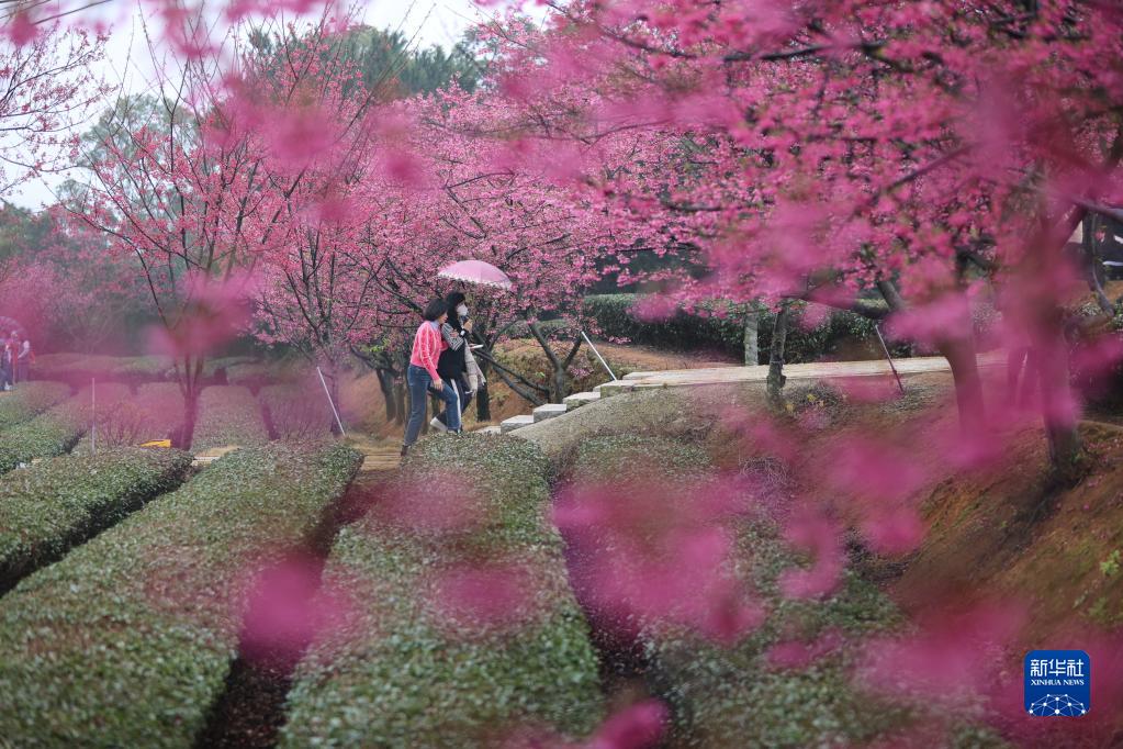 立春時節,福建省廈門市翔安區妙高山種植的櫻花在生態茶園里競相綻放,美不勝收。