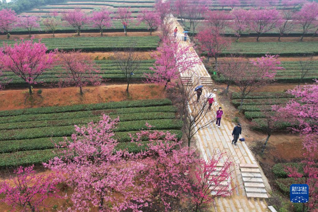 立春時節,福建省廈門市翔安區妙高山種植的櫻花在生態茶園里競相綻放,美不勝收。