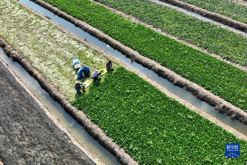 2月4日,在云南省個舊市大屯街道新瓦房村,農民在采收蔬菜(無人機照片)。